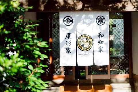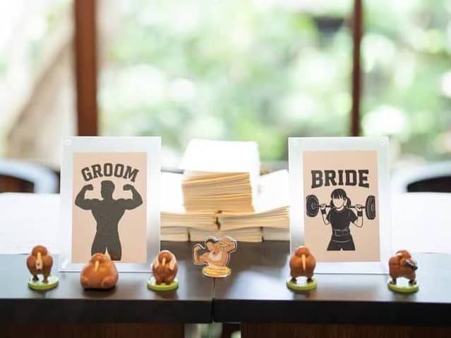 お互いの趣味が筋トレなので、「ローストビーフ入刀」や「ボディビル余興」、ジムのロゴ風にデザインしたのれんなど、筋肉要素をたくさん取り入れました。