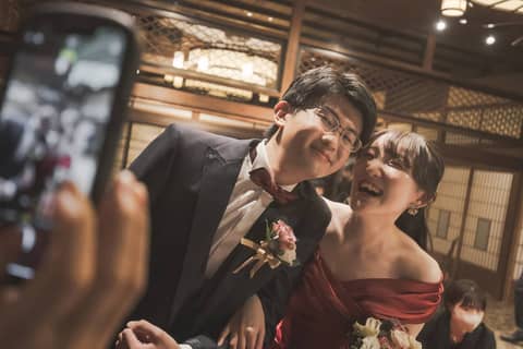 カメラマン様と司会者様にお願いしていたことに「絶対にゲスト全員とツーショットを撮る」と「絶対に全ての食事を食べる」があったので、ゲストに積極的に高砂に来てもらうよう声をかけていただいたり、食事が溜まったらアナウンスを止めてもらったりなども個人的にはこだわったポイントです笑